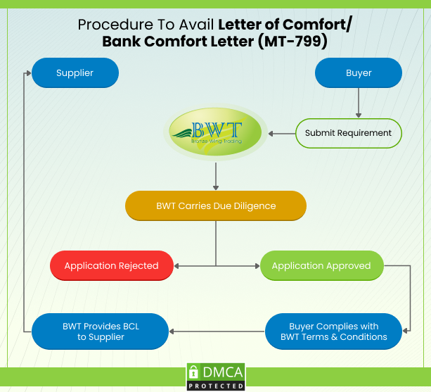 - Upon receipt of the draft approval and the issuance fee; we will instruct our bank to issue the Bank Comfort Letter. Accordingly, our Bank will transmit the BCL to the seller’s bank via authenticated Swift MT799. Further, this Swift MT799 proves the buyer’s fiscal ability to sign the contract.